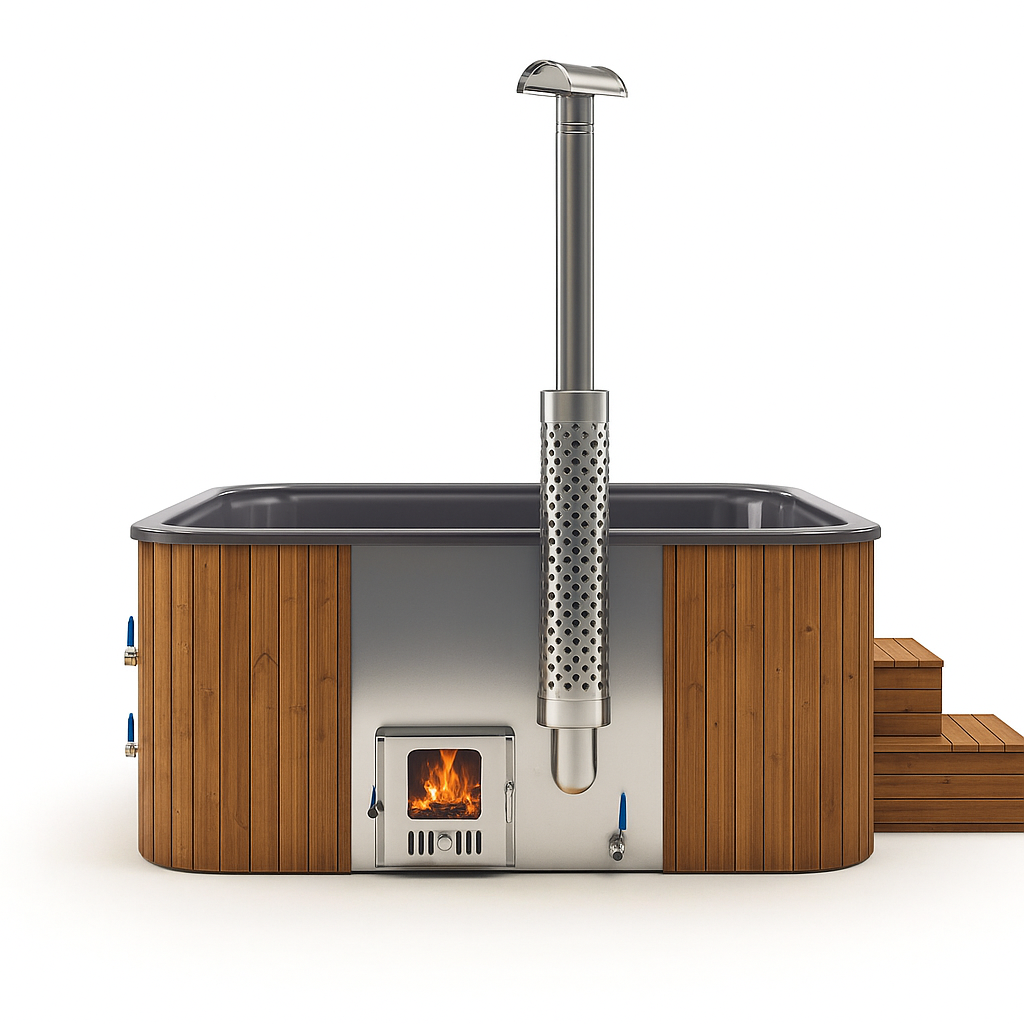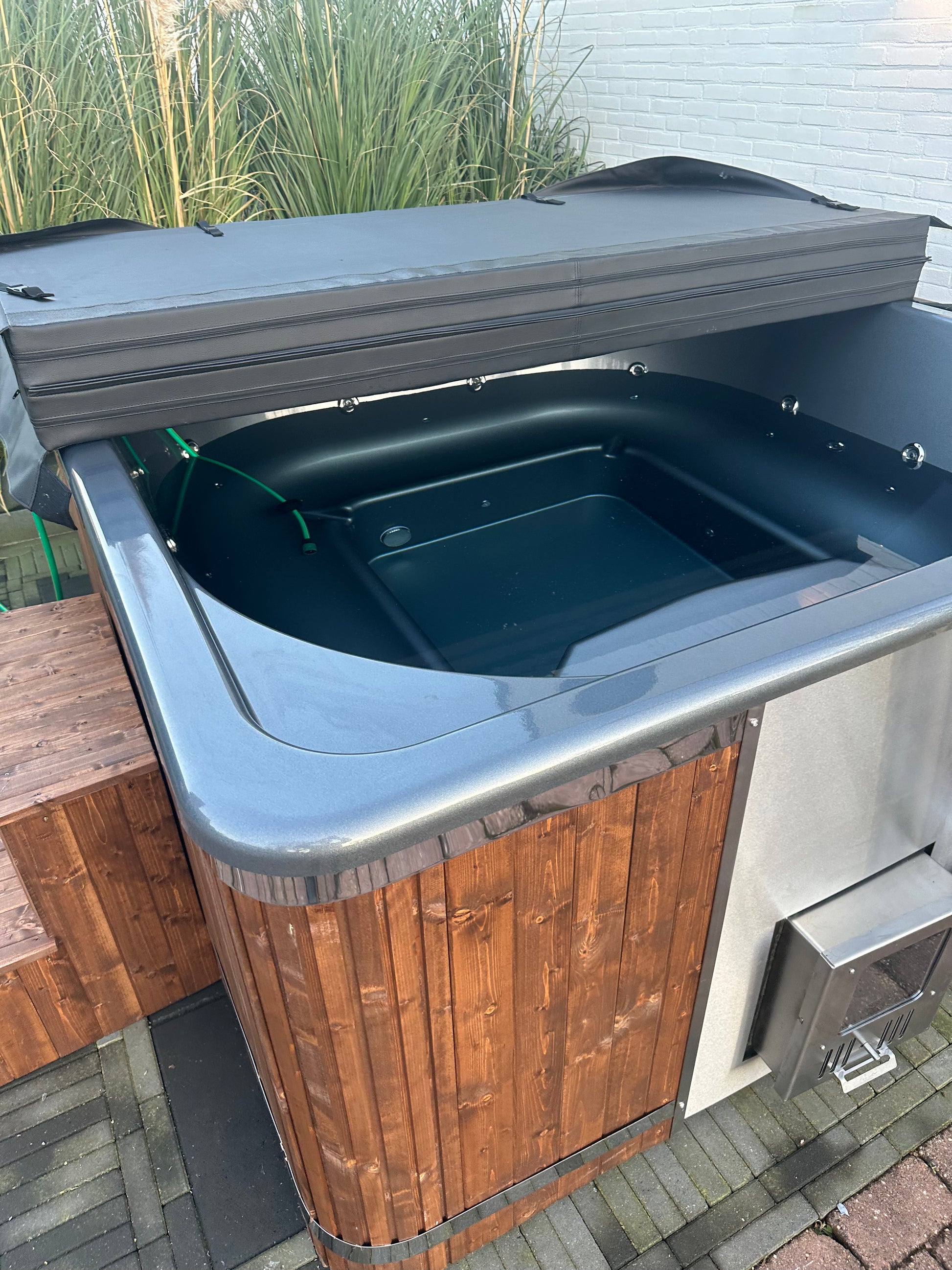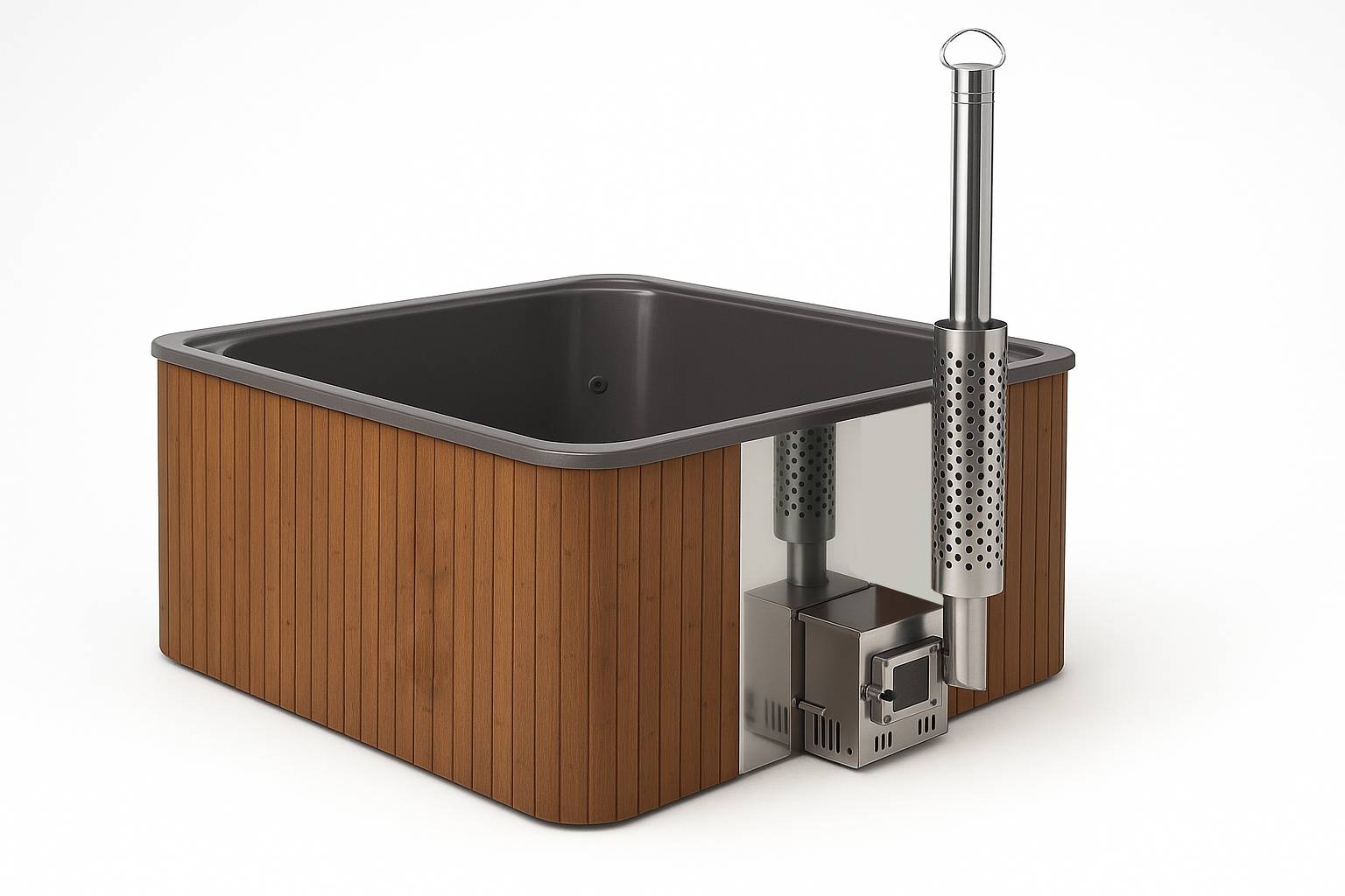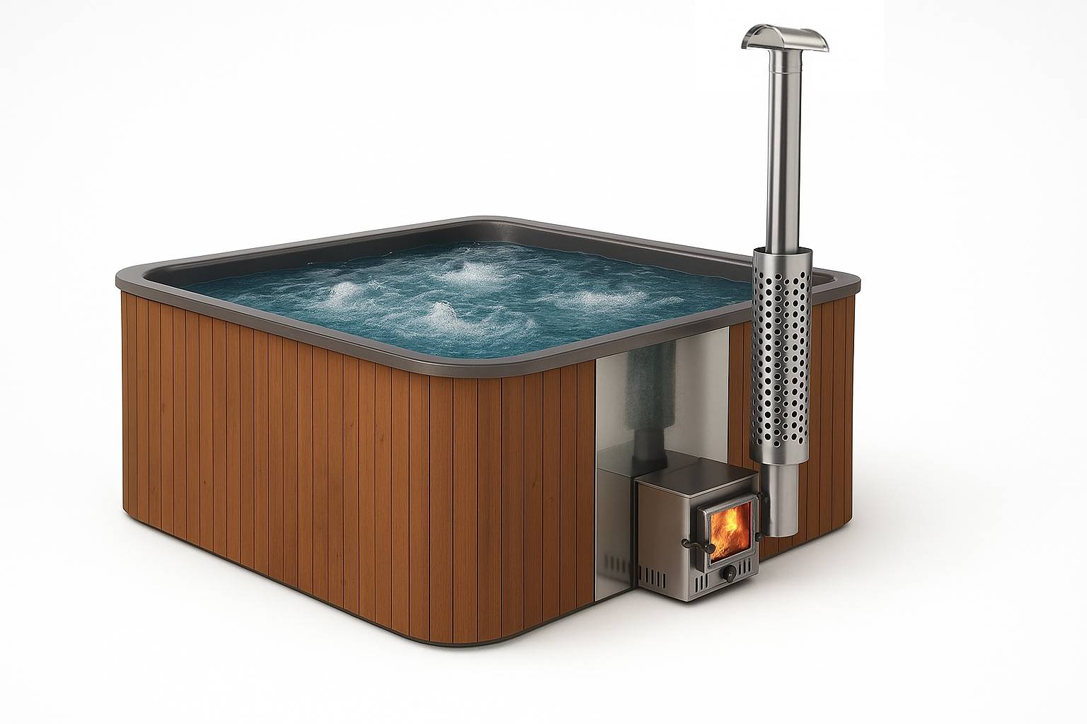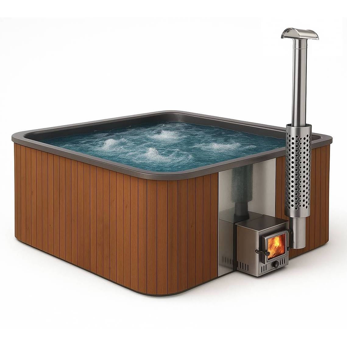 Malmo – Vierkante Luxe Hot Tub met Geïntegreerde Houtkachel - Massagejets, LED-Verlichting, Bubbelsysteem en Vrije Kleurkeuze