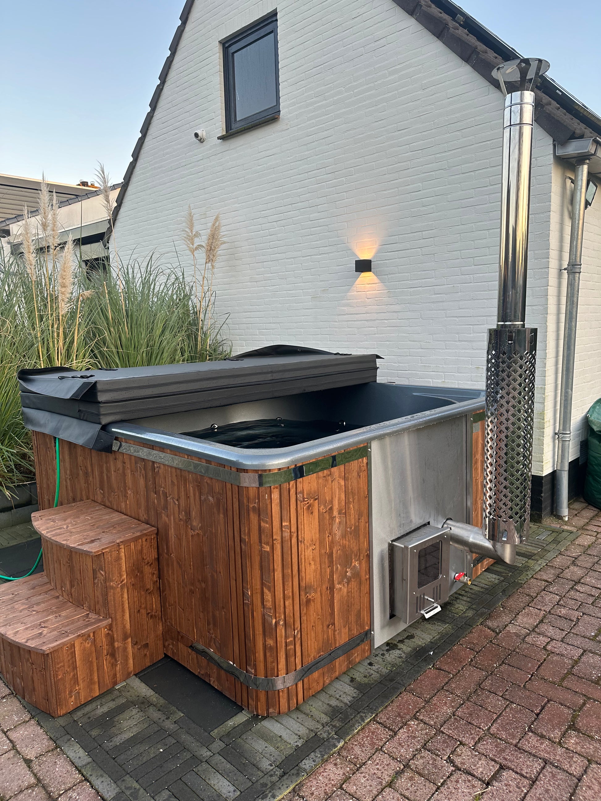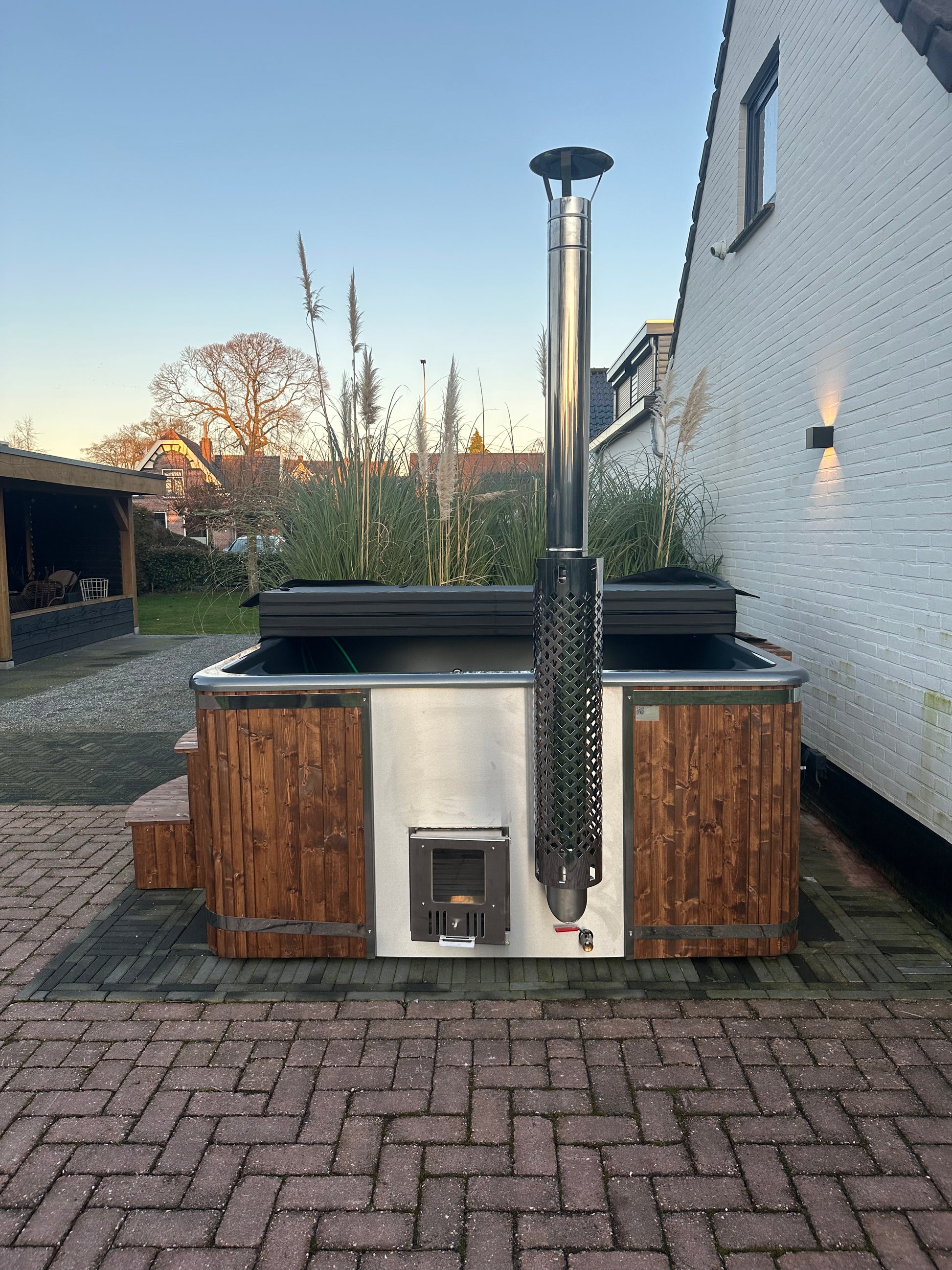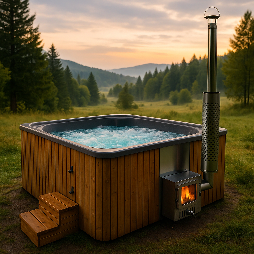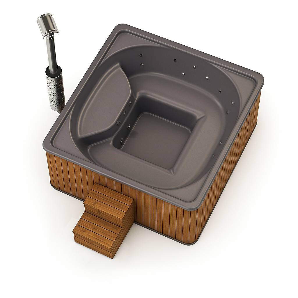 Malmo – Vierkante Luxe Hot Tub met Geïntegreerde Houtkachel - Massagejets, LED-Verlichting, Bubbelsysteem en Vrije Kleurkeuze